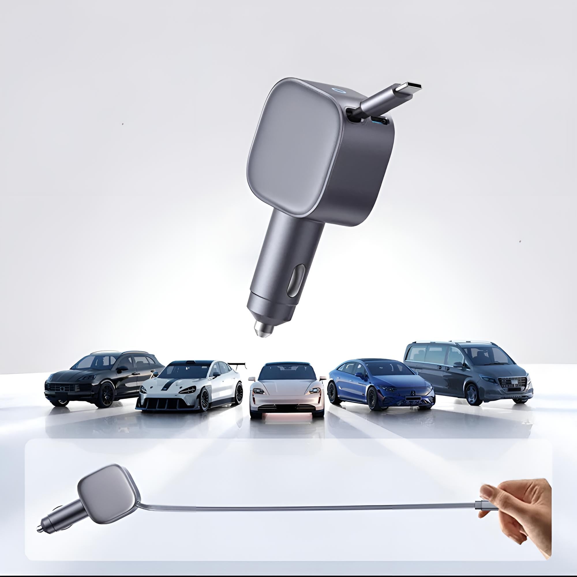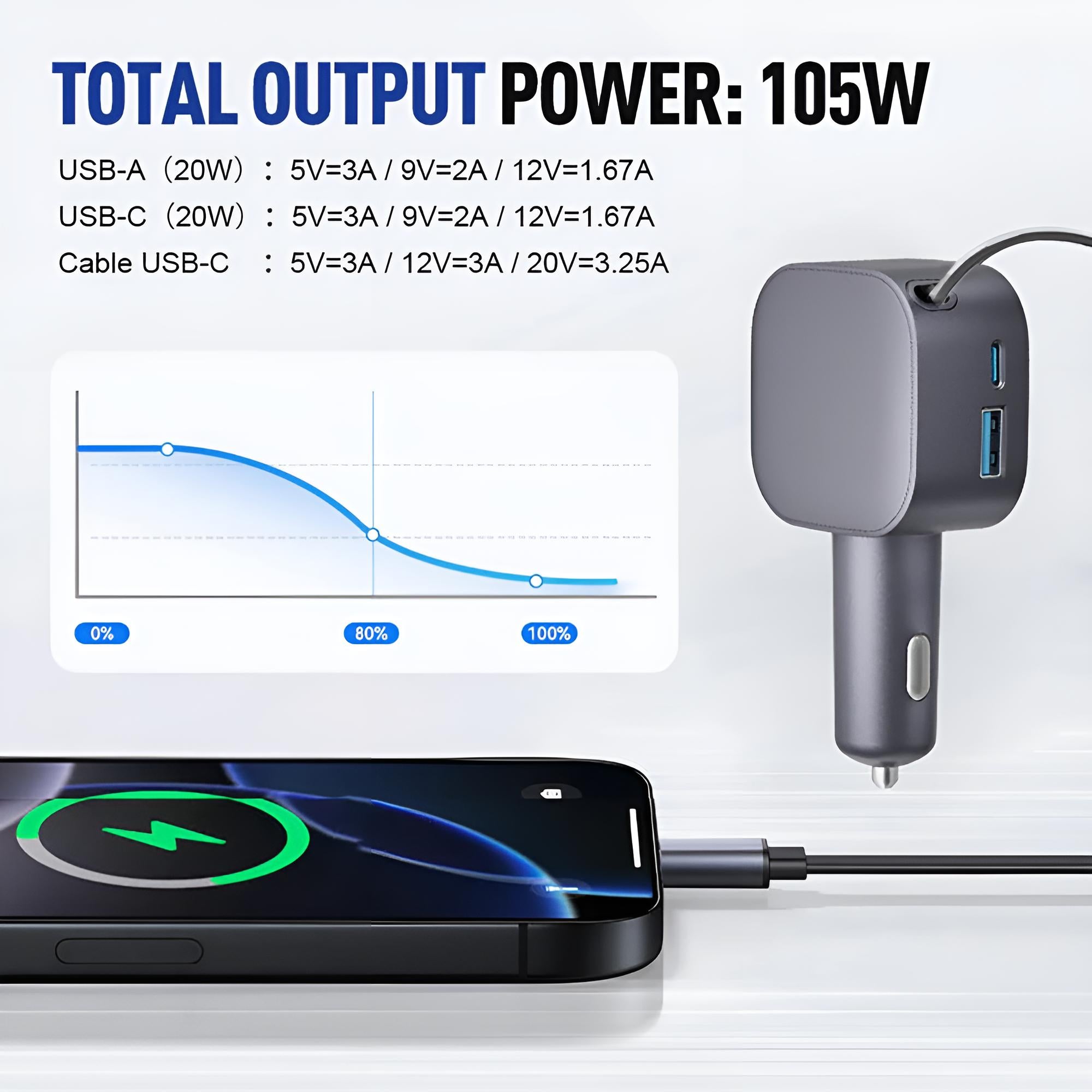 Das 2-in-1 einziehbare Autoladegerät ist die perfekte Lösung für alle, die unterwegs schnell, sicher und flexibel laden möchten. Mit seinem integrierten, 70 cm langen ausziehbaren Kabel sorgt es für maximale Bewegungsfreiheit ohne Kabelsalat – nach Gebrauch lässt es sich einfach wieder einziehen. Ausgestattet mit USB-A (20W) und USB-C (20W) Anschlüssen bietet das Gerät vielseitige Lademöglichkeiten für Smartphones, Tablets, Navigationsgeräte und andere USB-fähige Geräte. Trotz der kompakten Bauweise überzeugt es mit einer Gesamtleistung von 105W, was effizientes und schnelles Laden ermöglicht.