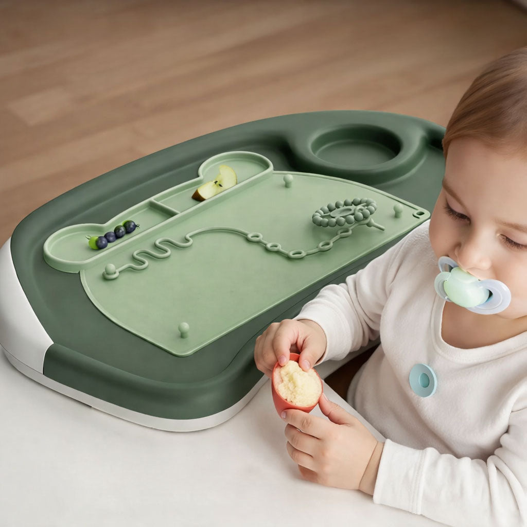 Die Baby-Silikonmatte- & Essmatte in vereint Spielspass und Funktionalität in einem durchdachten Design. Dank der 6 extra starken Saugnäpfe haftet sie sicher auf glatten Oberflächen wie Hochstühlen, Tischen oder Fenstern und verhindert lästiges Verrutschen oder Herunterwerfen. Integrierte bewegliche Elemente und flexible Befestigungen fördern spielerisch die Feinmotorik und sorgen für Beschäftigung während der Mahlzeit. Die Matte ist pflegeleicht, hygienisch und einfach zu reinigen – ideal für entspannte Essenszeiten und fröhliche Spielmomente.