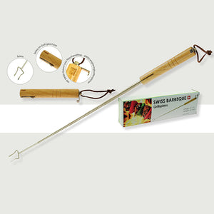 Die BBQ FLEX Grillgabel ist der ideale Blickfang für jedes Grill-Event. Mit einem griffigen Holzgriff und der praktischen Teleskop-Funktion lässt sich die Gabel von 17 cm auf 67 cm ausziehen – perfekt für den Grillabend oder unterwegs. Der Spiess kann komplett eingesteckt werden, was ihn besonders kompakt und einfach zu transportieren macht. Ideal für Ausflüge, Wanderungen und alle anderen Freizeitaktivitäten. Diese Grillgabel verfügt zudem über einen integrierten Flaschenöffner auf der Rückseite.