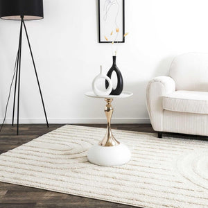 Dieser elegante Beistelltisch besticht durch sein modernes Design und seine edle Ausstrahlung. Die geschwungene Mittelstütze verleiht dem Tisch eine hochwertige Optik, während die weisse Tischplatte und der runde Sockel für einen harmonischen Kontrast sorgen. Mit seiner kompakten Grösse von 40 x 55 x 35 cm passt der Tisch perfekt neben das Sofa, ins Schlafzimmer oder als stilvolles Deko-Element in den Flur.