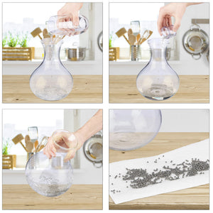 Karaffen und Vasen sind oft schwer zu reinigen und verlieren mit der Zeit ihr schönes Aussehen. Besonders in den schwer erreichbaren Ecken können sich hartnäckige Rückstände und Verschmutzungen ansammeln. Mit Hilfe von innovativen Reinigungsmethoden auf Basis einfacher Physik können diese Probleme jedoch mühelos gelöst werden, ohne dass chemische Reinigungsmittel erforderlich sind. Durch Zugabe von heissen Wasser zu den speziellen Reinigungsbällen und anschliessendem Schwenken des Gefässes werden Schmutz und Ablagerungen effektiv entfernt.