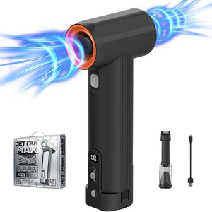 Dank des Staubsaugadapters eignet sich der Jet Fan MAX auch für kabelloses Staubsaugen unterwegs. Der austauschbare 24.000-mAh-Akku bietet bis zu 5,5 Stunden Laufzeit und ist über USB-C-Schnellladung in 2 Stunden wieder vollständig geladen. Eine stufenlose Geschwindigkeitsregelung mit 100 Stufen sowie ein Turbo-Modus sorgen für präzise Kontrolle.